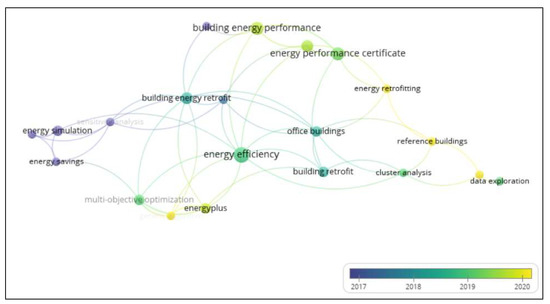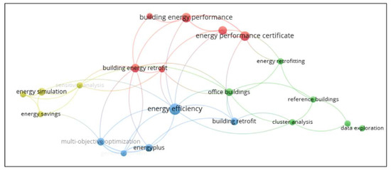 In keywords of co-occurrence analysis, four clusters (Figure 3) were found with 21 keywords and 50 links. The biggest nodes of each cluster were identified as EE (blue), building EP and EPC (red), office buildings (green), and energy simulation (yellow).