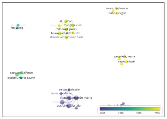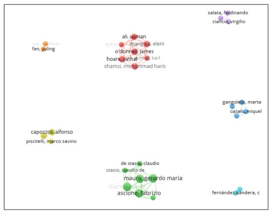 In the authors’ co-authorship analysis, seven clusters were found with 28 items and 54 links. Cluster 1 (green) relates to the top four author co-authorships ranked by link strength. For De Stasio Claudio with a link strength of 9 [23,24,25] and De Masi Rosa Francesca with a link strength of 8 [26,27] (Table 4), Cluster 2 (red) has seven items and found Ali Usman and Bohacek Mark. For Hoare Cathal, Mangina Eleni, O’Donnell James, Purcell Karl, Shamsi Mohammad Haris [28,29,30], Cluster 3 (yellow) has four items and found Casals Miquel, Ferré-Bigorra Jaume, Gangolells Marta, and Macarulla Marcel [31,32]. Cluster 4 (blue) has three items and found Capozzoli Alfonso, Cerquitelli Tania and Piscitelli Marco Savino [33,34,35], and Cluster 5 (cyan) has three items and found Ciancio Virgilio, Dell’olmo Jacopo and Salata Ferdinando [36,37]. Cluster 6 (purple) has two items: Fernández Bandera C and Ramos Ruiz G [38].