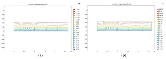 Isotherm distribution in COMSOL Multiphysics. (a) circulation air temperature +5 °C. (b) circulation air temperature +0 °C.