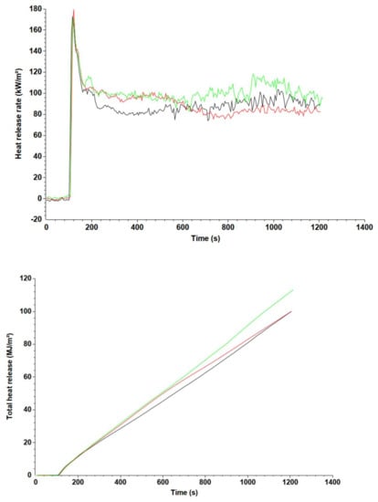 Amount of heat released during combustion of aramid panel (red—specimen 1; green—specimen 2; blue—specimen 3).
