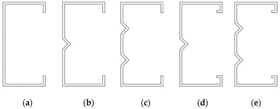 Figure 1 shows several typical cross-sections of CFS members. As a result of current trends, CFS sections become thinner and more highly stiffened, which are then more prone to local and distortional buckling [50,51]. Therefore, more complex shapes are being created to increase the buckling resistance [28,52,53]. For example, as shown in Figure 2, more complex shapes are created from simple lipped channels to include multiple segments, stiffeners, and lips. Substantial research in terms of experimental and numerical investigations of CFS sections behavior has revealed that adding intermediate web stiffeners and edge stiffeners enhances the strengths of such sections [54,55,56,57,58,59,60,61,62,63,64,65].