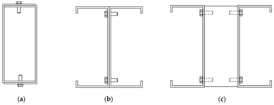 The literature has considered different cross-sectional geometries of CFS built-up sections [66,67,68,69,70,71,72,73,74,75,76,77,78,79,80,81,82,83,84,85,86,87,88,89,90]. As can be seen from Figure 3, the built-up channel sections are formed from two identical lipped channel sections connected face-to-face to form a box section, or back-to-back to form an I-section or back-to-back gapped built-up sections. Such built-up CFS sections can span further and can achieve higher compression and bending capacities [54,70,76].