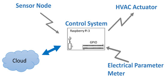 The temperature control system for the HVAC equipment is implemented on a Raspberry Pi. The components used with the Raspberry Pi are a sensor node, an electrical parameter meter, and an actuator for the HVAC equipment compressor.