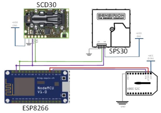 A NodeMCU ESP8266 based sensor node was developed to gather measurements of the environment variables. It included a Sensirion model SPS30 particulate material sensor and a Sensirion model SCD30 carbon dioxide, temperature, and humidity sensor. In addition, since the sensor network does not rely on Wi-Fi, a ZigBee network was used to implement the wireless communication to the control system. An XBee module was selected for this purpose. Figure 2 shows the developed circuit.