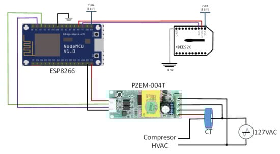 An electronic device created for that specific purpose, the PZEM-004T, was used to measure the electrical parameters. The PZEM-004T module is connected using its serial channel to a NodeMCU ESP8266. A program in the NodeMCU ESP8266 is used to read the data from the PZEM-004T module and then wirelessly transmitted to the Raspberry Pi using an XBee communications module. The PZEM-004T measures voltage, current, power, frequency, power factor, and power consumption. The electrical meter module is used to measure the performance of the HVAC equipment. Figure 3 shows the interconnection of the circuits used.