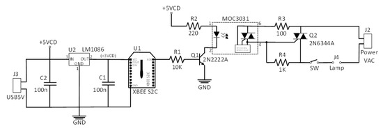 An actuator module was designed to control the turning on/off of the HVAC equipment. A solid-state relay was built using an 8 amp TRIAC 2N6344A. The circuit has an XBee module to communicate wirelessly with the Raspberry Pi. The solid-state relay receives an instruction from the Raspberry Pi to turn on (full power) or off (null power) the HVAC compressor via wireless through XBee modules. Figure 4 shows the circuit implemented for the actuator.