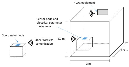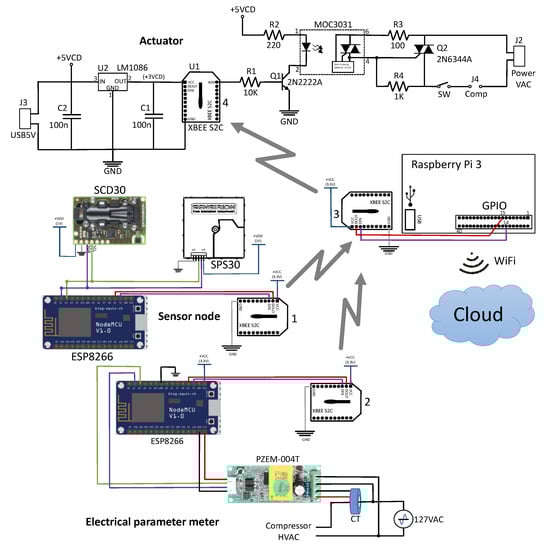 The sensor node was developed to measure relative humidity, temperature, carbon dioxide, particulate matter 2.5 and, particulate matter 10. Temperature and relative humidity values are used to establish a thermal zone, and both are used to control the HVAC equipment. Figure 1 shows a schematic diagram for the control system.