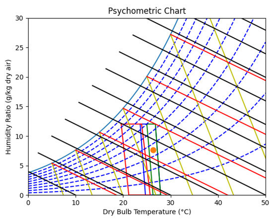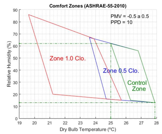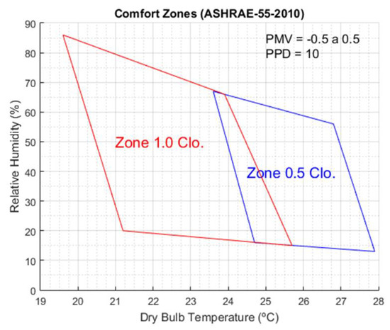 The ASHRAE-55-2010 standard [26] uses the PMV method to calculate the thermal comfort zones graphically for typical indoor environments. Thermal comfort zones are determined using different variables, including humidity, wind velocity, metabolic rate, and clothing insulation. These comfort zones are defined in terms of a range of operating temperatures that provide acceptable thermal ambient conditions or in terms of the combinations of air temperature and mean radiant temperature that occupants find thermally acceptable.