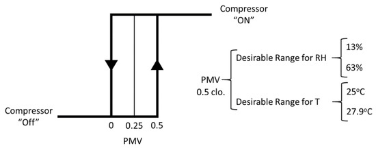 The temperature and relative humidity values gathered from the sensor node are used to locate the HVAC equipment’s operating point. With these data, the PMV and PPD indices are calculated and used to control the on and off of the HVAC equipment. The PMV value must be between 0 and 0.5 for 0.5 clo. Clothing and this parameter is set as the hysteresis window for the control system, and the setpoint value must be set to 0.25, i.e., controlling the compressor by turning it on and off in the range of 0 to 0.5. According to ASHRAE [26], in this range of PMV, the desirable range for relative humidity and temperature are 13% to 63%, and 25 °C to 27.9 °C, minimum and maximum, respectively. Figure 6 shows the comfort zones recommended by ASHRAE for 0.5 clo. And 1.0 clo. Figure 7 shows the control zone of the proposed control system. Figure 8 shows the setpoint for the HVAC compressor.