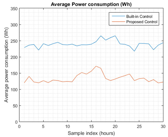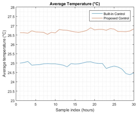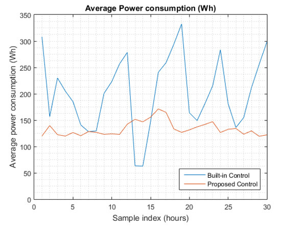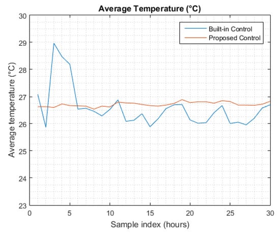 Figure 17 and Figure 18 show the average power consumption and temperature behavior with the proposed and built-in control system with 26.58 °C. In Figure 17, the average power consumption shows a varying behavior due to the operation of the built-in hysteresis control of the HVAC equipment. For example, in the sample hours 13 and 14, the average power consumption depended only on the fan motor, i.e., the compressor was off for the whole hour. On the other hand, when the built-in control works with the default settings, its operation is smoother (Figure 12).