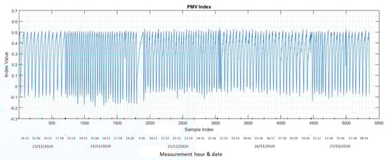 In [1], an automatic temperature setpoint PMV-based control system was developed. This PMV-based control contains a communication unit, a monitoring device, and sensors. The goal was to determine the effectiveness of the proposed control at reducing electrical energy consumption while maintaining the users’ thermal comfort. The ambient temperature and relative humidity for three representative days were selected and used to calculate the PMV value and simulate in a climate environmental chamber its operation. The typical days selected were an intermediate season day, a winter season day, and a summer season day. For a typical summer season day, the PMV index values ranged from −0.6 to 0.6, with an average value of 0.06 with the proposed control system. This control system obtained 39.5% of energy savings.