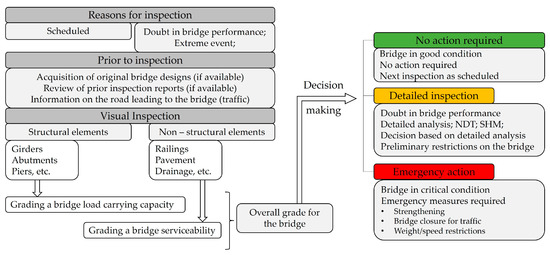 Visual inspection is a fundamental tool for bridge assessment and decision making (Figure 2). The visual inspection of a bridge greatly differs from that of any other structure due to bridges’ generally longer life span, exposure to very aggressive environmental conditions, and structural elements made of different materials with different deterioration processes and rates. Improper and untimely maintenance leads to rapid changes in the slope of the time-related deterioration curve that determines the remaining service life of individual bridge elements [11,12], and the failure of any non-structural element (such as waterproofing, drainage, and expansion joints) is critical to the duration of the remaining service life.