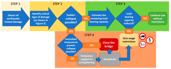As noted earlier, the bridges needed to be assessed quickly because their availability was critical to many emergency services throughout the region. Previous experience in visual inspection, damage detection, and classification [19,20] was an important prerequisite for the bridge assessment team, as was experience with the seismic behavior of bridges [29]. Therefore, the teams with this practical knowledge were called in and conducted their assessments with the help of the road and transportation authorities.