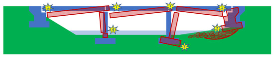 The abovementioned types of collapse may occur independently, or they may be interconnected to form a progressive zipper-type collapse [10] in which the failure of the first element causes the failure of the second element, then that of the third, and so on, thus creating a cascading overall collapse of the bridge. Of course, the possibility of any or all of these collapse scenarios here depended on a bridge’s structural system, location, and foundation type. These collapse scenarios could even occur in the coming days, weeks, or months after the main earthquake during the numerous small or moderate magnitude aftershocks that frequently occurred after the main Petrinja earthquake. They could even occur as a result of heavy traffic (axle loads or velocity-induced vibrations) on a structure or foundation soil that had reached a critically unstable equilibrium that is easily unbalanced over the tipping point. If such a possibility was detected, the bridge was to be immediately closed for traffic.