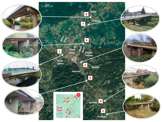 Geographical overview of Glina county bridges for post-earthquake rapid assessment.