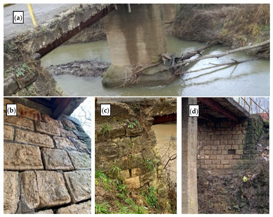 Matija Gubec street bridge: (a) columns—large foundation for the column in the middle of the riverbed and scour visible on the east column; (b) abutment stone wall damage; (c) abutment sliding signs; (d) evidence of subsequent abutment sliding—stone wall integrity compromised.