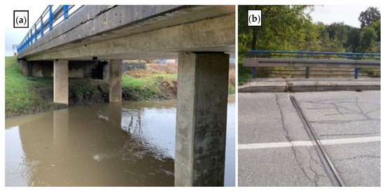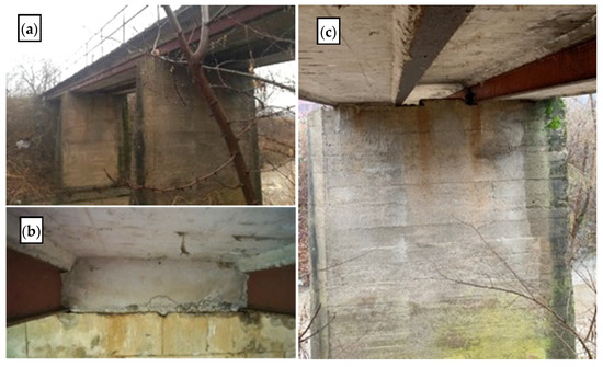 Prekopa bridge crosses the river Maja at the north access road to Glina (Figure 5). The bridge has a continuous girder slab superstructure with over three spans of 10.15 + 12.55 + 10.15 m (Figure 6). Its reinforced concrete slab is 50 cm thick and 8.1 m wide, with 0.9 m consoles on each side. Its superstructure is supported by twin 3.9 m high columns at each side of the riverbed (the cross-section of each column is 1.0 × 0.5 m) and 2 m high and 1.7 m long abutments. There are no bearings on the bridge, and supports are realized as concrete hinged sections at the top of the substructure elements (Figure 13a). In comparison to the other examined bridges, this bridge was found to be fairly new, erected in 1999. An open drainage system and waterproofing were observed, so no serious long-term water damage was found.