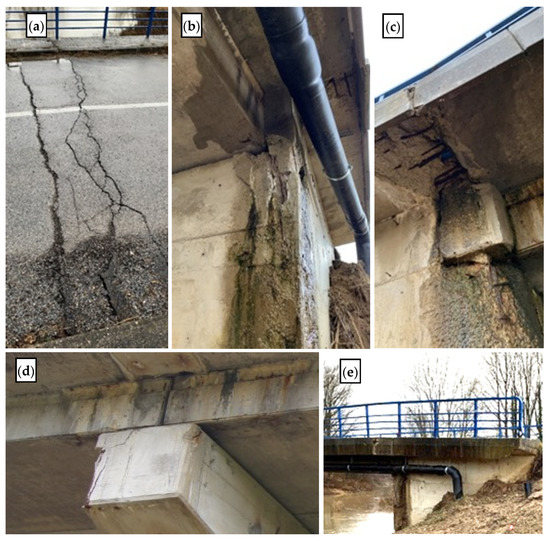 Hađer bridge: (a) damage caused by earthquake in the asphalt; (b) fractured abutment side wall due to the earthquake; (c) water leakage from superstructure end, causing damage to abutment; (d) uneven support length for the girders; (e) cracked cornice due to earthquake movement.