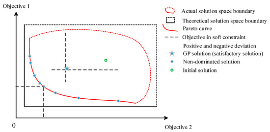 In a mathematical expression, total n priority levels and m objectives are listed in the utility function, where d+ and d− represent the positive and negative deviational variables, respectively. Pj represents the priority level of the jth objectives. The deviational variables reveal the deviational distance to the objectives. Generally, since the decision value is impossible to exceed, and cannot exceed the target at one time, the formula d+ × d− = 0 is always true [45]. Shorter distances from the deviational variables to the targets denote better optimization effects. In order to examine the relative importance of the objectives in the same priority levels, w, as the preferential weight, is used and can be determined by the multi-criteria decision making (MCDM). The hard constraints are placed in the first priority level to define the solution space boundary. The soft constraints are arranged in the other lower levels to satisfy the DM’s will, and the priority of the upper level objective is considerably more important than those in the inferior levels. Finally, the optimized solution is obtained by comparing the deviational values in the corresponding ranks. Although incommensurability does not occur in different priority levels, normalization techniques, such as Euclidean normalization [46], the zero–one normalization [47], and the percentage normalization [43], are still required to judge the optimization effects of different objectives in the same priority level.