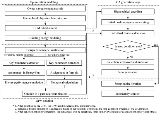 Since a large number of design parameter combinations are considered in the optimization model, long execution time is expected in the solving procedure due to the approximately 3 to 5 min of EnergyPlusTM execution time for each design scenario. In a worst-case scenario, the total optimization time can reach over hundreds of years [15,22]. Therefore, an overall research scheme driven by Python code is proposed in this study to speed up the entire solving procedure, as presented in Figure 2, which contains three main modules: optimization modeling, the GPM solution, and the GA generation loop. As shown in Figure 2, there are three processes connecting these three modules by delivering necessary information. The functions of the arrows 1, 2, and 3 are explained in this figure. Optimization modeling is responsible for providing the GPM for the GA iteration. The GPM solution is the process to calculate the design scheme performance. When the stop condition (preset deviation thresholds) is met, the iteration ends and outputs the satisfactory solution.