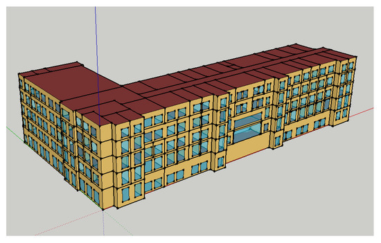 A five-story office building located inside the campus of Dalian University of Technology, Liaoning Province, China, was selected for the case study. The building is located in an area with the typical temperate monsoon climate. The energy model of this complex office building established in Google Sketchup is shown in Figure 3. The building total area is 10,445 m2, and the internal space is divided into different types of office spaces such as professors’ offices, students’ offices, meeting rooms, laboratories, corridors, and file rooms. Each type of office space (or room) has its own energy consumption pattern, and Table 1 lists the detailed classification standards, acquired by site survey. In this case, the energy consumption patterns in Table 1, including occupant behavior, internal loads, equipment, are input in the EnergyPlus model as model parameters in standard parametrized form. In view of the pre-determined purpose and construction plant of a newly designed building, only envelope-related parameters are considered as the tuning variables in the optimization process. The thermal bridge is neglected in this case, and the case selects the ideal air conditioner system by default. In addition, although many scenarios are not considered in this case, the architectural appearance is flexible based on the Sketch Up modeling and EnergyPlus simulation scheme, especially because the EnergyPlus strictly follows a parametrized three-dimensional coordinate input module. The space size, window size, space shape, etc., can be easily replaced in the optimization model to meet various design requirements, such as greater light comfort and architectural aesthetic, by only numerical input.