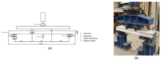 A four-point bending arrangement was followed to test the hollow cellular panels as depicted in Figure 3a,b. The panels were simply supported at an effective span of 1000 mm. The load was applied at the mid-span through a hydraulic piston onto roller supports at 334 mm spacing from each other. The test was displacement controlled at the rate of 2.5 mm/min. A laser transducer was placed underneath the panel at the centre of the panel to measure the mid-point displacement. Electrical resistance strain gauges were positioned at the top and bottom of the panel. Three strain gauges were positioned at the bottom of the panel: SG1 and SG3 below the load points and SG2 at the centre of the panel. At the same time, SG4 was placed at the centre of the top skin of the panel (Figure 3d). A data acquisition system connected to the load frame was programmed to capture the applied load, displacement, and strain data. The panels were supported by timber blocks positioned in the panels and above the supports, as shown in Figure 3c. It was done to prevent the primary crushing of corrugations when the load is applied and to ensure an appropriate failure mode.