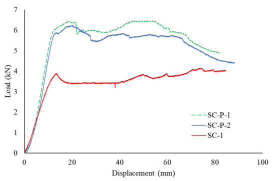 Both single-cell panels with mid-plate (SC-P) attained an average ultimate load of 6.34 kN, which is 76% higher than the panel without mid-plate (SC) which had an ultimate load of 3.60 kN. It suggests that the mid-plate contributes to a significant load-carrying capacity of the panels. The mid-plate also mobilises the contribution of the lower sheet in load-carrying capacity at the early stages of loading. In the panels without a mid-plate, the lower sheet will only take part in load resistance at the later stages of loading due to the lack of connectivity with the top plate. It is seen from Figure 4 that all single-cell panels exhibit excellent ductile behaviour.
