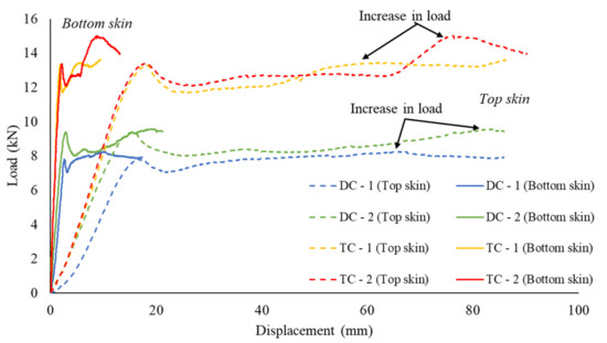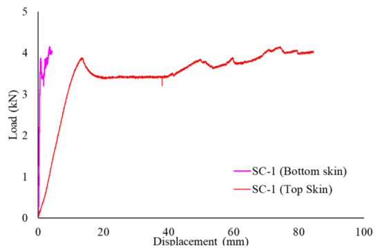Displacement on the top skin is significantly high, whereas the bottom skin started to deflect later without any noticeable amount compared with the top skin. During the test, the displacement in the bottom skin was initiated only after the top skin touched the bottom skin. This observation is evidenced by the bottom and top skin displacement at ultimate loads as 0.91 mm and 15.30 mm, respectively (Table 2). It implies that the mid-plate contributed to distributing loads and displacements between the top and bottom skins.