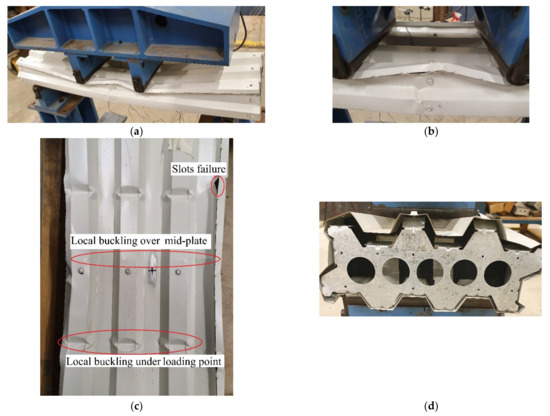 The mid-plate in single-cell panels, SC-P, provided an excellent resistance to load. Flexural failure of the panel (Figure 7a), local buckling around the mid-plate (Figure 7b) and below the loading point (Figure 7c) were observed. The slots provided for bending of the sheets also suffered tearing at these critical points. The failure of slots can be attributed to compression of the top skin of the panel over the mid-plate. This behaviour was noticed towards the end of the test when large displacement values beyond 50 mm were already attained. The top skin of the panels also began to separate from the endplates due to these high displacements, as shown in Figure 7d. However, it was observed that the mid-plate was acting as a medium to transfer the load from top skin to bottom skin of the panel and hence the full capacity of the panel was exploited.