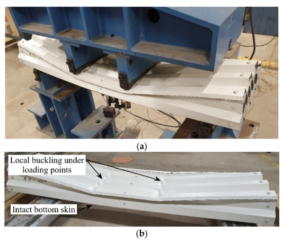 The panel without the mid-plate also failed by flexure (Figure 8a). However, local buckling was noticed only below the load points. It is seen from Figure 8b that only the top skin of the panel suffered failure while the bottom skin remained significantly undamaged. Similar to panels with mid-plates, separation of the skins from the endplate was noticed at higher displacement beyond 50 mm.