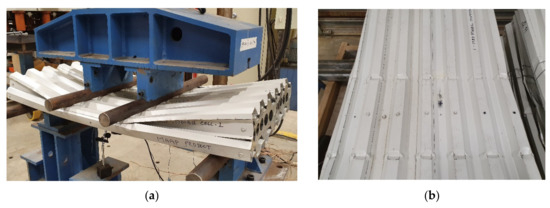 Out of the above test specimens, a couple of single cells were provided with a mid-plate to assess its role in the structural behaviour of the panel for initial investigation. The mid-plate position is shown in Figure 1d. This plate is made of steel, cut to the panel’s shape, and is provided at the centre of the panels at 600 mm as a support element. Multi-cell panels were tested without mid-plates to achieve a complete hollow cellular system. It was assumed that the overlap of sheets in multi-cell panels would enhance the structural efficiency eliminating the need for mid-plates. Thus, the multi-cell panels were kept at a constant total width of 600 mm with an individual cell width of 300 mm for double cell panels and 200 mm for the triple cell panels to assess the structural performance of the overlapping sheet system. Another aim of testing multi-cell panels with different cell widths was to observe the role of various cell configurations in their overall structural behaviour as a flooring system.