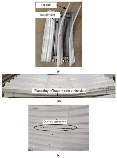 (a) Failed double cell panel. (b) Local buckling in triple cell panel. (c) Open triple cell sample with the intact bottom skin. (d) Flattening of bottom skin at slots. (e) Separation at the overlap of double cell-1.
