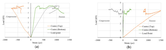 In contrast, the top skin continues in tension until it touches the bottom skin of the SC panel, after which distortion is seen in the strain (Figure 10b). After this point, the bottom skin experiences minor tensile strain. This behaviour was observed once the top skin touched the bottom skin and can be seen from the green colour plot in Figure 10b. The lack of combined action of the double skin can also be noticed from the strain under the load point, which only began when the ultimate load was achieved. The results indicate that the middle plate in SC-P utilised the entire panel capacity to act as a whole. In contrast, the load-carrying capacity of the SC panels was lower than that of the SC-P panel, where each skin acted independently.