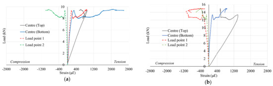 The load–strain curves were analysed to record the variations in the panel behaviour and identify the critical points of failure. From strain measurements on either side of the panels to monitor the individual behaviour of the top and bottom skins, it is evident that in the panels with mid-plate, the top and bottom skins reported similar behaviour with identical performance in the tension and compression zones. However, in the case of the panels without the mid-plate, the bottom skin started recording significant strains only after the top skin reached its maximum tension capacity. This behaviour indicates the double-skinned action is enhanced and efficient only with mid-plates or any other medium to distribute the loads between the top and bottom skins of the hollow panels.