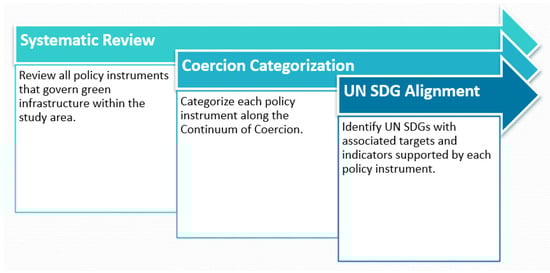 The first step in the ex-post E-RIA pathway was to conduct a systematic review of all existing policy instruments within the study area or jurisdiction. The second step was to categorize each policy instrument along a continuum of coercion that illustrates different levels of government control over specific activities. The third step in the methodological pathway was to identify the individual UN SDGs supported by each policy instrument and the associated targets and indicators.