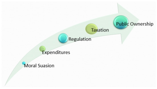 The policy continuum of coercion illustrates different levels of government control over specific activities. Moral suasion instruments are the least coercive, exhorting or admonishing the target group to pursue or cease a particular action. For example, many jurisdictions will ask residents to limit all non-essential water use such as car-washing during heatwaves, in order to conserve and maintain adequate water levels for emergencies such as firefighting. Other moral suasion examples include alcohol and tobacco cessation advertising campaigns illustrating the deleterious health effects of consumption. Expenditures are low-level instruments of coercion that seek to incentivize behaviour change through financial means. For example, many jurisdictions will offer a rebate for energy efficiency retrofits undertaken on a residence to reduce greenhouse gas emissions [73]. Eligible retrofits may include installation of new windows, energy efficient appliances, solar panels, or high efficiency furnaces. Other examples include grant programs in flood prone areas to reduce repetitive flood risk to building infrastructure [74]. Regulation is a more coercive instrument. For example, many jurisdictions prohibit dumping of chemicals, toxic waste, or garbage into rivers, lakes, or other marine environments, and will impose heavy fines and penalties for violations. Other examples include imposing vehicular speed limits and requiring the use of seatbelts when driving. Taxation is a very coercive instrument that seeks to discourage certain behaviours by imposing a financial burden on the targeted activity. For example, some jurisdictions have implemented a congestion charge to reduce vehicular traffic and air pollution in urban centres [75,76]. Other examples of heavily taxed commodities include alcohol and cigarettes. Public ownership is the most coercive of all policy instruments wherein the state will take on the ownership and administration of a particular activity in order to maintain complete control over it. Examples include the production and distribution of crude oil, and the generation, distribution and sale of electricity.