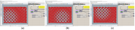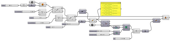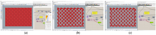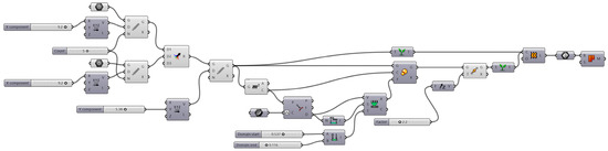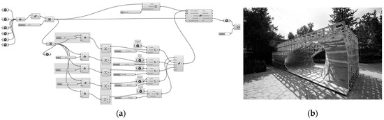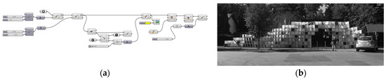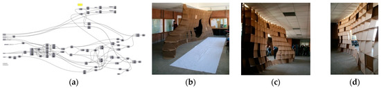 The concept of the “Lacusta” installation (2011, Timisoara, Romania) was based on separating two different areas of the faculty’s main hallway: the circulation and the sitting area by the window, the dynamic zone and the static zone, the semi-public and the semi-private one. While experimenting for the first time with parametric design and digital tools (such as Grasshopper (Figure 1a), the name of the workshop being its actual translation into Romanian), this student-initiated workshop was held during a weekend, in which the design and manufacturing process have been finalized, in order to surprise the teachers with the installation on the next working day. The final result can be seen in Figure 1b–d.