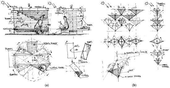 (a) Conceptual sketch of the interactive installation; (b) Conceptual sketch of the installation kinetic modules influenced by light and humidity.