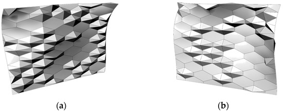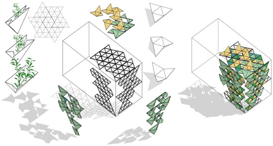 Analyzing existing green wall typologies through their historical development [16] as well as a detailed classification [17] based on studies undergone at the Technical University of Delft, Delft, The Netherlands by Dr. Marc Ottelé [18], permitted an overview of the systems, valuable observations and conclusions on well-functioning components and parts that needed improvements. As a result of these initial studies, the team has agreed on the importance of one determining principle that was going to shape the design process and the final result: modularity. The practical aspects of well-designed modular green walls [19] are advantageous in terms of flexibility of implementation, usage and maintenance; thus, an important part of the project was research towards identifying the optimal shape for the system module, one that would respond to alteration in shape and size, movement, rotation, while ensuring sufficient stability and correlation of the overall structure [20]. Sequential deformation processes of the base module were experimented, using paper folding techniques for physical modeling, parametric design software and 3D printed prototypes, until the result was reached.