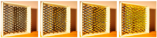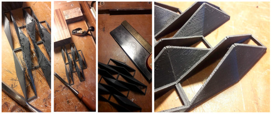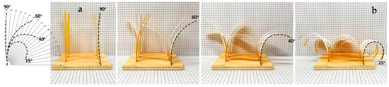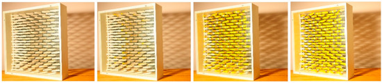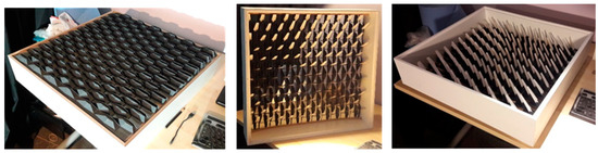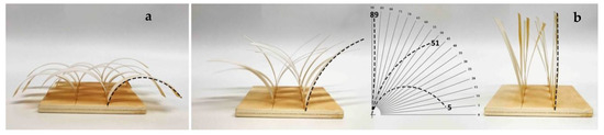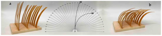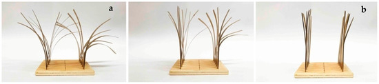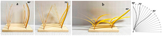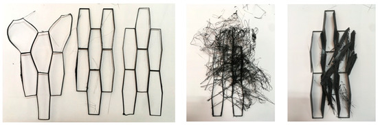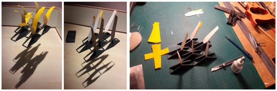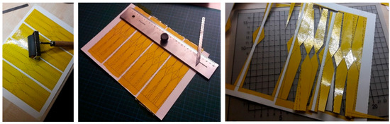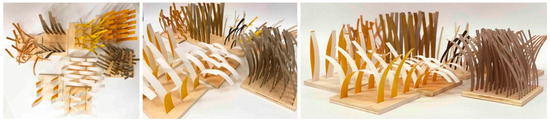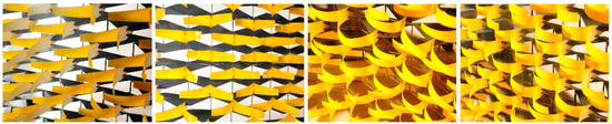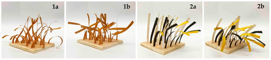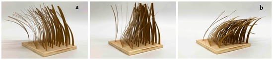 The developed concept consisted of an array of composite lamellae, which, through the features of the material itself, would respond to external factors, such as environmental humidity levels and temperature variations. Choosing the simplest raw materials and studying how to put them in place in order to emphasize their natural dynamic features, the experiment included two different components. Firstly, we used Kapton tape [25] for its temperature sensitivity, whereas we secondly used hygroscopic materials, which do not show such openness to temperature changes (copy paper, package paper, watercolor paper, sycamore veneer of Kraft paper), as seen in Figure 8, Figure 9, Figure 10, Figure 11, Figure 12, Figure 13, Figure 14, Figure 15, Figure 16, Figure 17, Figure 18 [26].