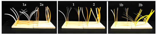 Drawing paper and Kapton tape—comparison between 2 different samples with tape on the exterior (1) and interior (2) and shape change influenced by temperature variations, 18 °C (1a and 1b) up to 50 °C (2a and 2b).