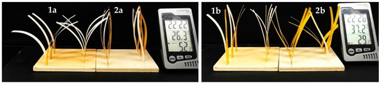 Drawing paper and Kapton tape—comparison between 2 different samples with tape on the exterior (1) and interior (2) and shape change influenced by temperature variations, 18 °C (1a and 1b) versus 50 °C (2a and 2b) with thermometer.