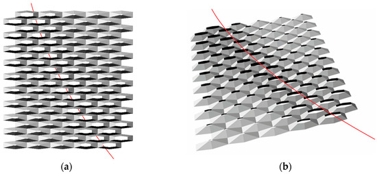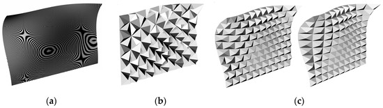 Furthermore, in 2017, the concept of the “Static Pulsation Wall” was being developed in the same context (Figure 4) [21]. Furthermore inspired by nature, namely the freedom of movement and dynamic of bird flocks, this installation added a new layer to the developing experience of the team members throughout their experiments, as it also considered the possible constant change of the installation, thus opening the dialogue about interactivity. While studying the functioning “mechanism” of the flock and the influence each bird has in the definition of its ever-changing geometry, the modeling process involved an actuator, for the first time, meaning that one of the modules of the installation would influence its entire resulting shape. Even though the interactivity was only used during the generation of the digital definition, the successive experimentation with iterations of the shape would subsequently be implemented as live features of the developed installations.