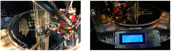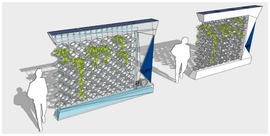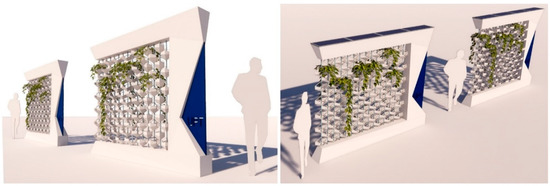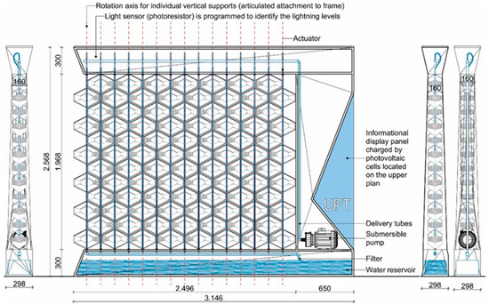 The motion principle of the mechanism is structured in two main response types. Principally, the sensors captured external and natural stimuli such as lighting, solar radiation, and humidity. They communicate the parameters to the main automation system, implemented by means of a dedicated software (inside a programmable logic controller—PLC, the entire system being powered by an 800 W photovoltaic panel, and, if necessary, by a connection to the public electricity network), who will activate the actuators (materialized by small servomotors) that enabled the movement of the structure’s green modules. This programmed motion was intended to improve the life of the plants in urban areas by directing them towards the needed beneficial natural light for photosynthesis, respectively, warding them away from harmful solar radiation (and blocking it by activating the integrated shading panels), and also watering them using the incorporated irrigation system due to detecting low levels of air humidity as seen in Figure 5b.