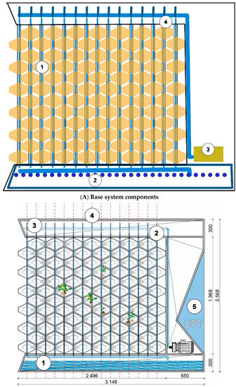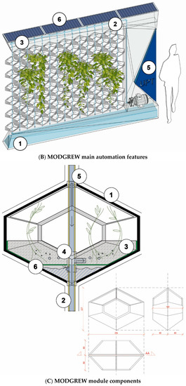 Main features of the Modgrew system. (A) Growing chambers—base of each module (1), Water reservoir (2), Submersible pump (3), Delivery tubes—primary and secondary (4); (B) “C” shaped frame integrates the water reservoir, delivery tubes and other equipment (1), PLC based automation Irrigation system, which allows optimal watering of the plants (2), Light sensor placed to detect the exterior lighting levels (3), 15 rotation axes, one for each individual vertical support, articulated on base (4), Informational display panel for all pieces of equipment, connected to PLC, having a dedicated software application (5), and 4 Photovoltaic 200 W panels, located on the upper plan that power the whole assembly (6); (C) Complex geometry with full base and skeletal upper part (1), Circular section delivery tubes (flexible) + circular section support tube (metallic, rigid) (2), Growing chamber with porous growing substrate or root support adapted to plant species (3), Water alimentation and re-tention and overflow system (4), Elastic gasket (5), and Debris filtration layer (6).