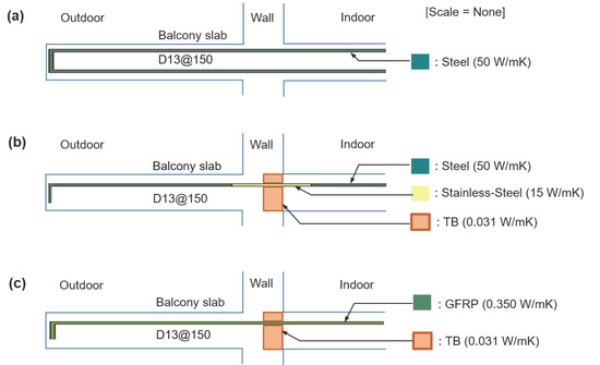 To understand the balcony thermal bridges, a typical balcony slab attached to an exterior wall was modeled as the object of the analysis. There are three analytical conditions: a wall with external and internal insulation systems, an interior with an air heating system or radiant floor heating system, and a balcony slab with and without a TB. The original concrete balcony slab without any TBs was used as the reference case. As shown in Figure 1a, the thermal conductivity of steel reinforcing bar used in the balcony slab was 50 W/mK [38]. The analysis data of the reference cases were used to compare the results of the balcony thermal bridge with TBs.