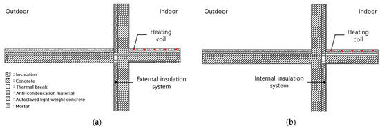 In addition, various insulation systems applied in buildings can affect the heat transmittance of thermal bridges. Internal insulation systems have been commonly applied to apartment buildings in Korea because of easy installation and low construction cost. However, the application of external insulation systems is steadily increasing to achieve energy saving target for building sectors [43]. Therefore, the analysis cases were divided into balcony thermal bridge models with internal and external insulation systems (Figure 2 and Table 3).