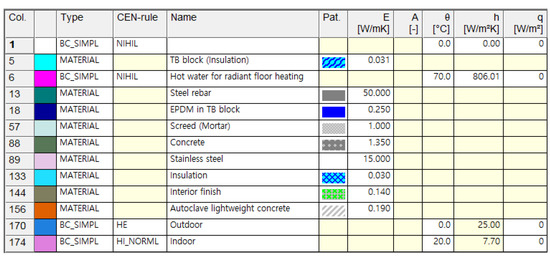 Figure 3 shows the material properties and boundary conditions used in the Physibel simulations. The same structure layer and materials were applied to all simulation cases, except for the case of TBs. Internal and external insulation systems were also analyzed assuming the same material and thickness. For boundary conditions, the indoor and outdoor temperatures were set to 20 °C and 0 °C, respectively. Hot water temperature and flow rate for radiant floor heating system was assumed as 70 °C and 0.014 kg/s, which corresponds to the internal heat transfer coefficient of 806 W/m2K.