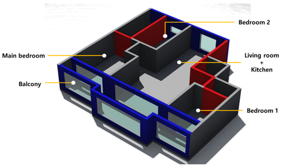 The linear thermal transmittance was adopted to evaluate the heating energy demands as well as the impact of the TBs on the thermal bridge reduction. Heating energy demands of apartments with different balcony slab structures were analyzed using TRNSYS simulation, wherein the linear heat transmittances of the thermal bridges were inputted as parameter of external walls. To evaluate the heating energy demand, a simulation model for a typical apartment house in Korea was developed as shown in Figure 4. The investigated apartment was composed of four heated zones: a living room and three bedrooms, which is one of the most common configurations in Korea. The location of the building was assumed as Incheon, which is located in the central region of South Korea. It was assumed that the main orientation of the building is the South and the balcony is attached to the South of the building.