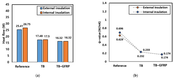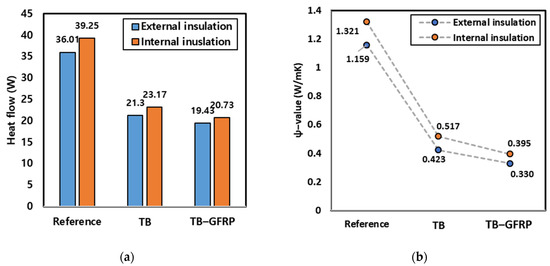 Figure 5b shows the results of linear thermal transmittance (ψ-value) with thermal breaks. The ψ-values of reference thermal bridge (Case 1), the thermal bridge with TB (Case 2) and TB-GFRP (Case 3) were 0.629 W/mK, 0.232 W/mK, and 0.174 W/mK, respectively, when the external insulation system was applied. In case of the internal insulation system, ψ-values were 0.696 W/mK (Case 4), 0.233 W/mK (Case 5), and 0.174 W/mK (Case 6), respectively. It is shown that the ψ-value was reduced using TBs, regardless of the external or internal insulation systems. The reduction rate of ψ-value was 63.1–72.3% for the external insulation, and 66.5–75.0% in the internal insulation.
